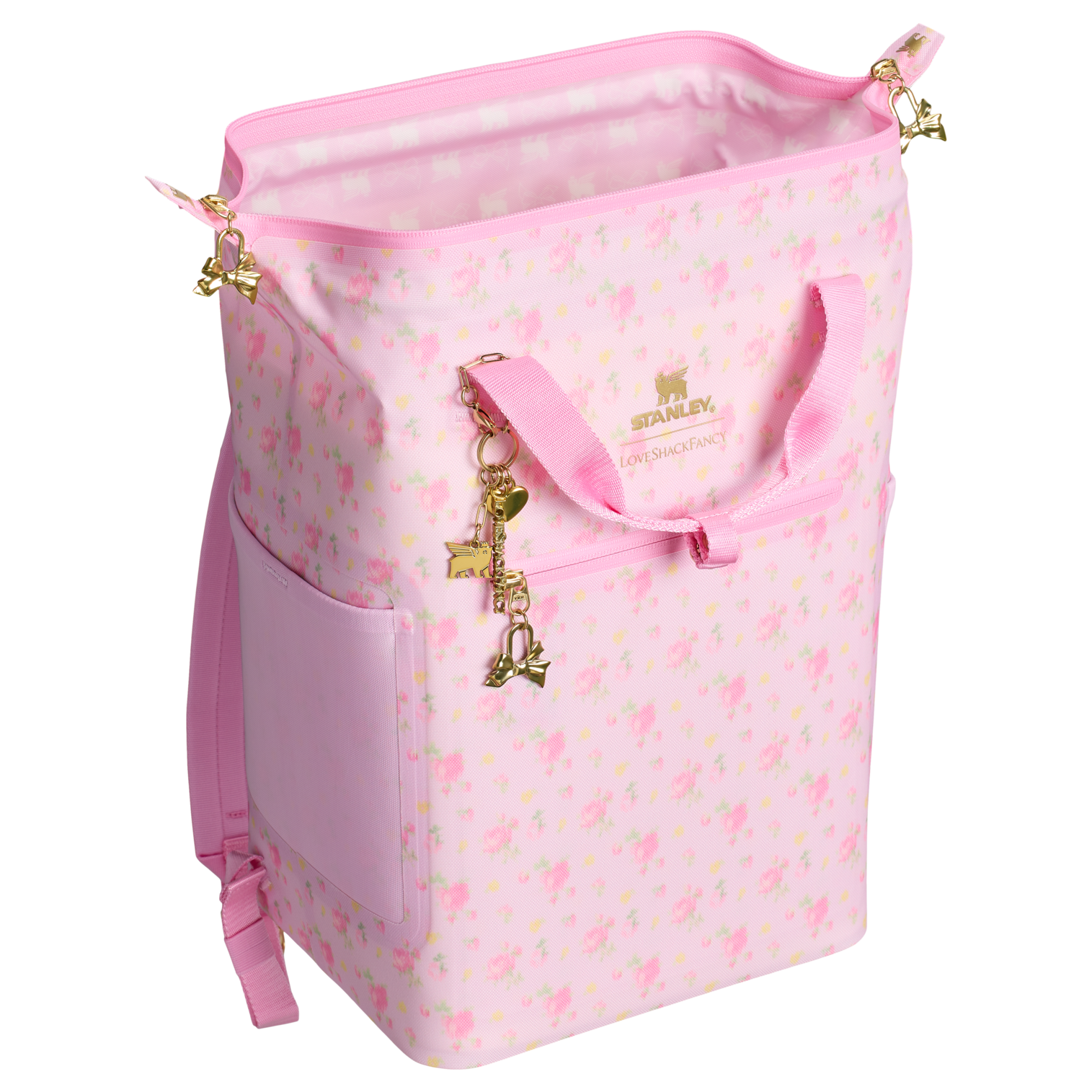 Dressed up with LoveShackFancy bow zipper pulls and gold charms, the All Day Mini Cooler Backpack has a unique “doctor’s bag” hinge top that pops open for packing ease. There’s even a mesh pocket on each side, designed to fit a Quencher or your bottled drink of choice.