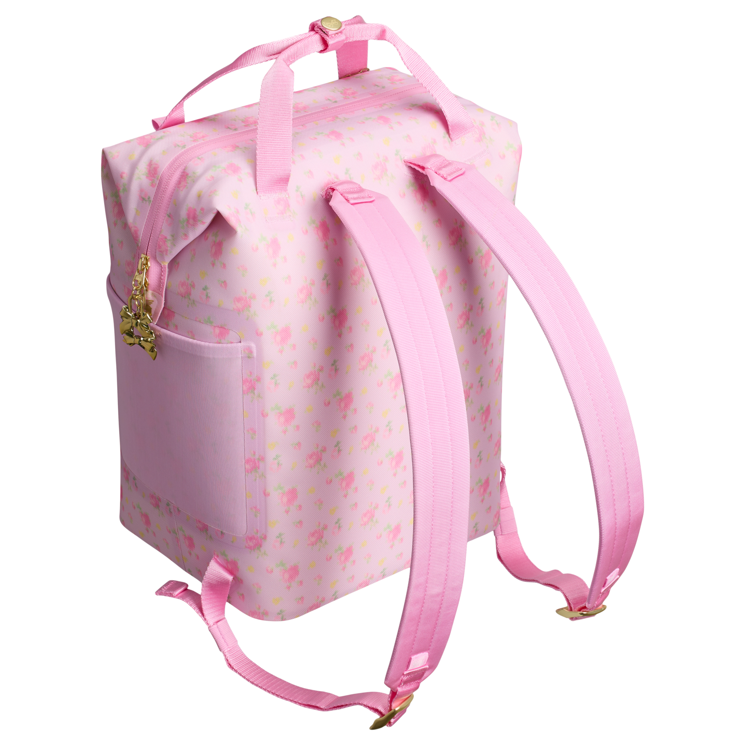 Dressed up with LoveShackFancy bow zipper pulls and gold charms, the All Day Mini Cooler Backpack has a unique “doctor’s bag” hinge top that pops open for packing ease. There’s even a mesh pocket on each side, designed to fit a Quencher or your bottled drink of choice.